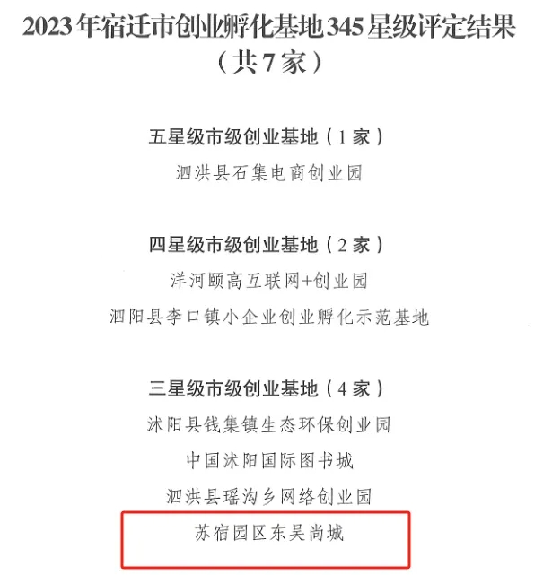 近日,2023年宿遷市創(chuàng)業(yè)孵化基地345星級評定結(jié)果發(fā)布,宿遷市蘇宿園區(qū)建設(shè)發(fā)展有限公司服務(wù)項目園區(qū)公舍東吳尚城創(chuàng)業(yè)孵化基地榮獲2023年宿遷市創(chuàng)業(yè)孵化基地三星級稱號。